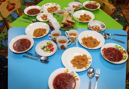 Питание детей в детском саду организуется в соответствии с 10-дневным меню, разработанным с учётом физиологических потребностей детей в калорийности и пищевых веществах. В детском саду имеется картотека блюд с разработанными технологическими картами, позволяющими выдерживать все требования к приготовлению разнообразных детских блюд.