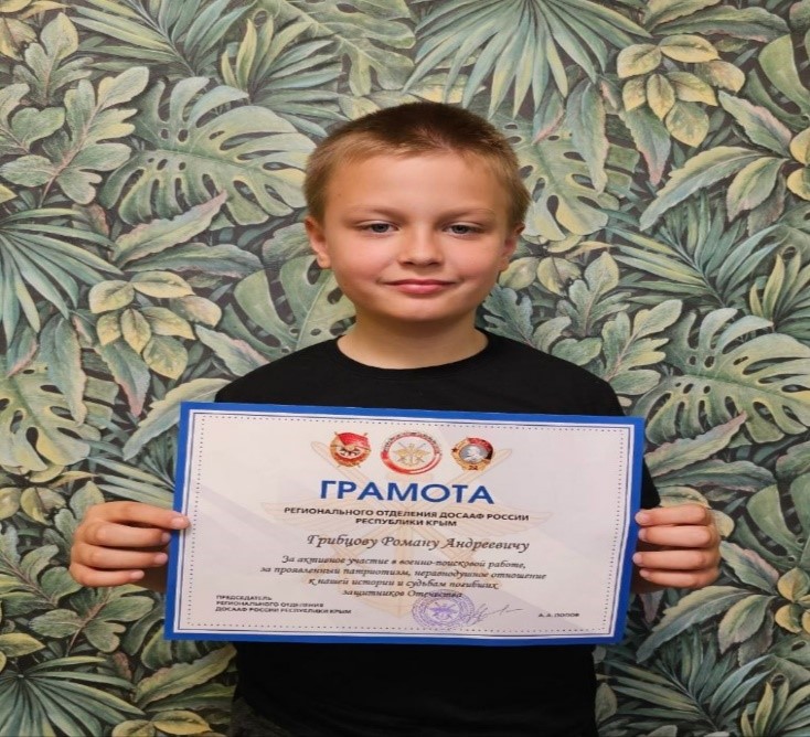 Воспитанник кадетского класса Грибцов Роман награждён грамотой Регионального отделения ДОСААФ России Республики Крым. За активное участие в военно- поисковой работе, за проявленный патриотизм, неравнодушное отношение к нашей истории и судьбам погибших защитников Отечества.