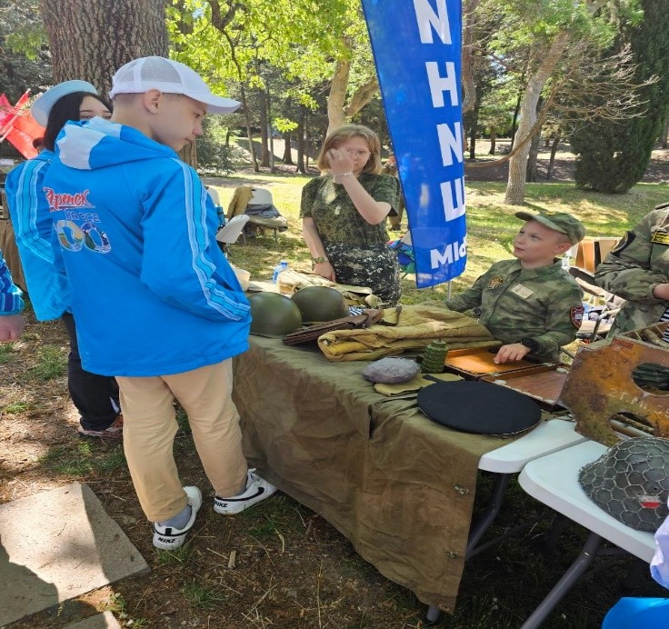 На территории МДЦ "Артек" проводилась выставка, посвящённая II мировой войне. Посетители могли познакомиться с разными экспозициями военного времени.