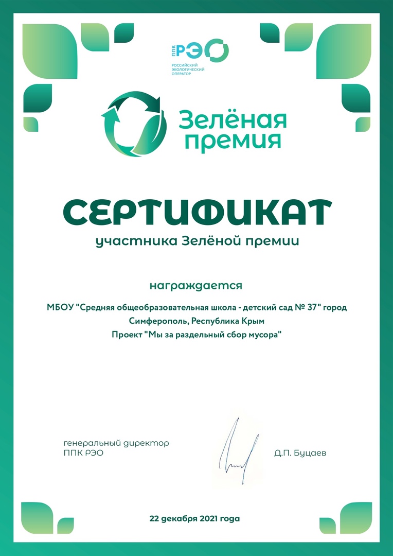 МБОУ "СОШ-ДС №37" за активное участие в экологической акции «Зеленая премия» российским экологическим оператором (РЭО), была награждена сертификатом участника проекта "Мы за раздельный сбор мусора".