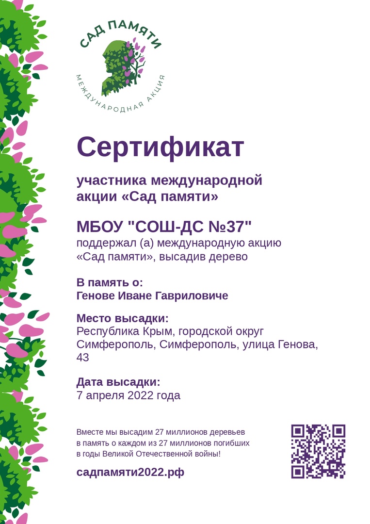 Ежегодно в рамках Акции учащиеся, воспитанники, педагоги МБОУ «СОШ-ДС №37» высаживают деревья, кустарники, цветы в память о погибших героях Великой Отечественной войны и солдат, защищающих честь и достоинство своей Родины. Весной 2022 года в Акции приняли участие 55 педагогов, 680 учащихся и 150 воспитанников детского сада.